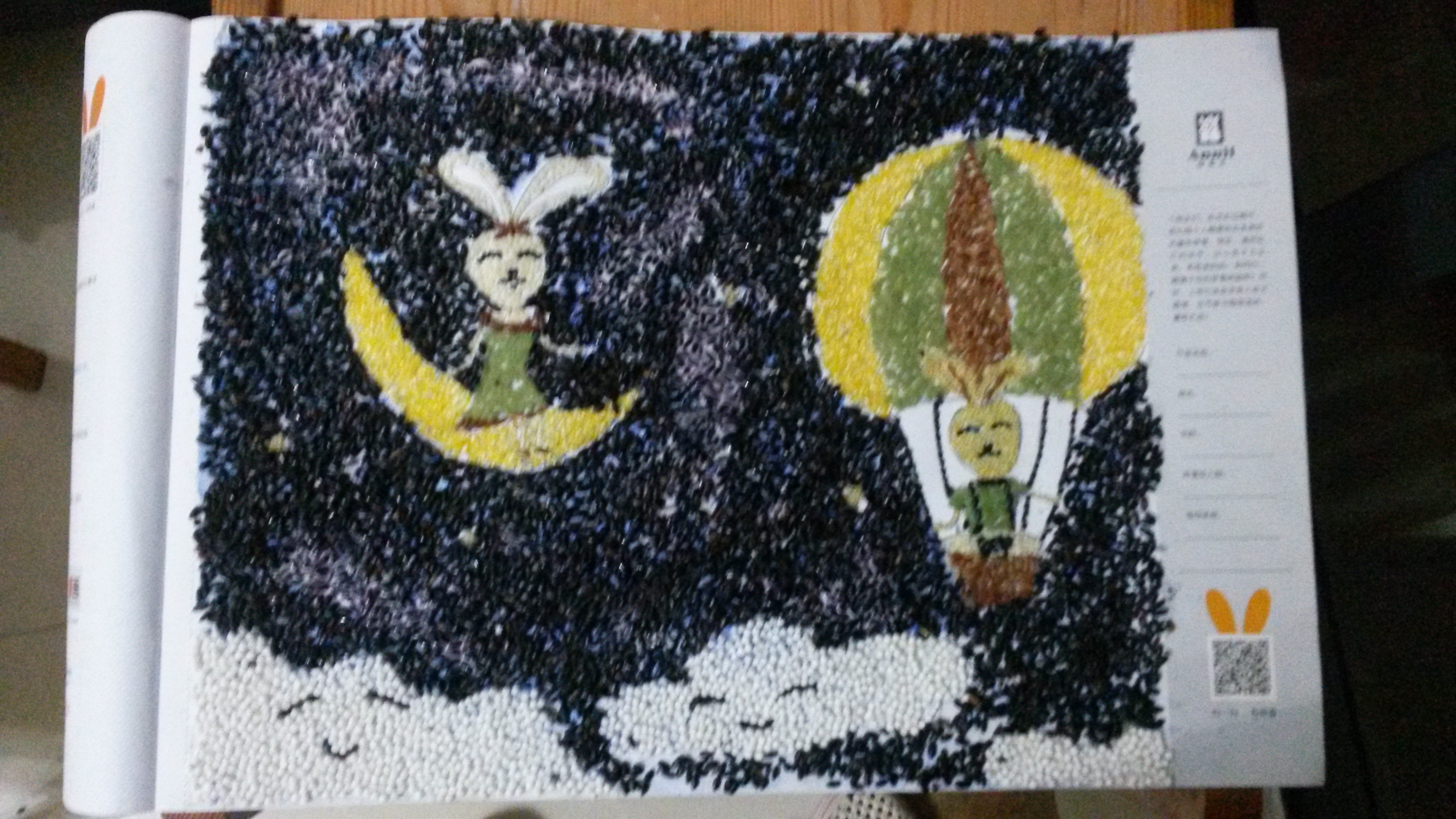 - 作品描述:本作品所有材料有红米、小米、玉米、黑米、竹青米、西米、芝麻。飞越和飞月是同音哦,是希望所有小朋友长大都能为祖国实现中国梦努力,飞越梦想,快乐成长!