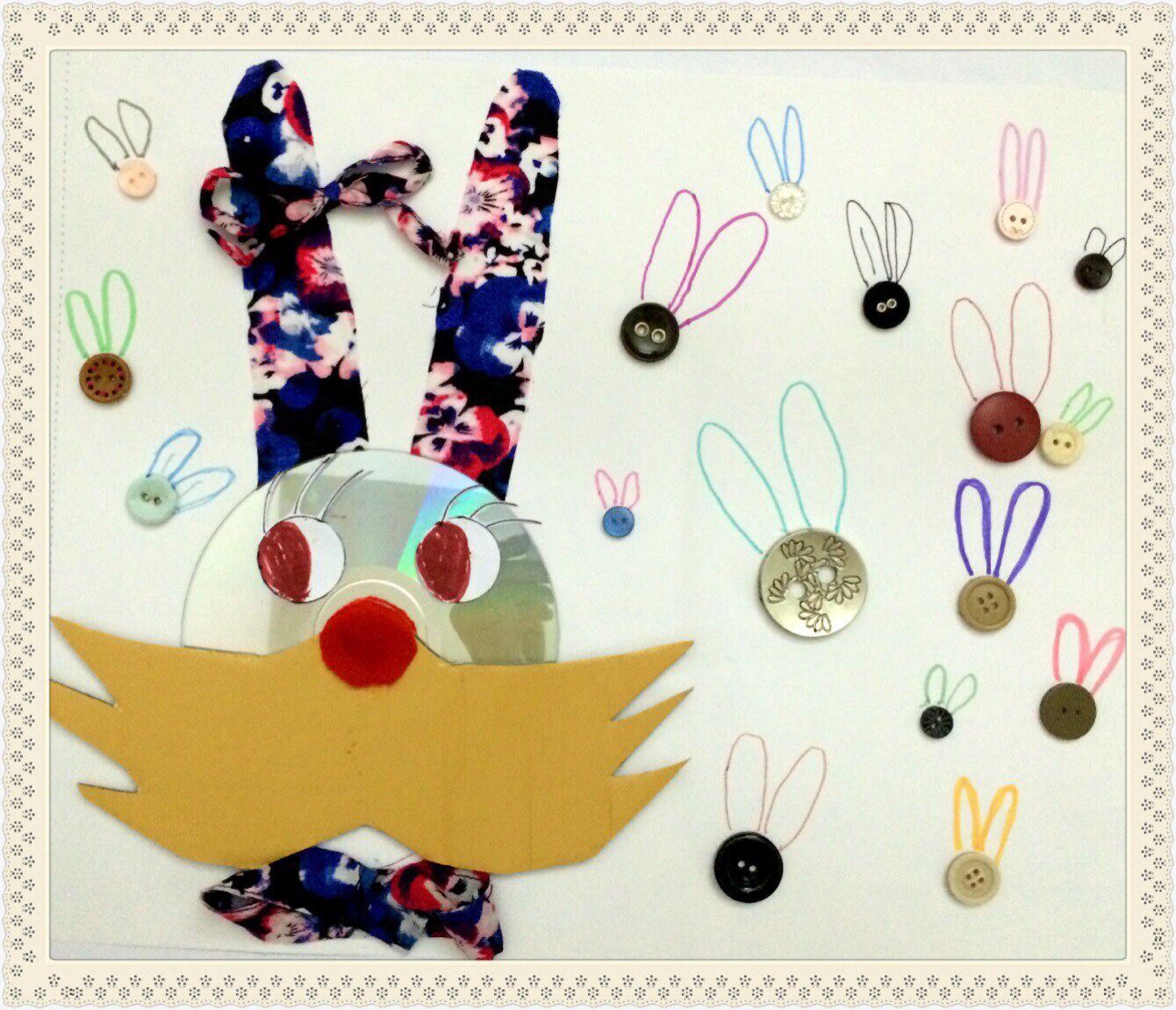 布料、光盘和硬纸片做成的大兔子身边布满了来参加兔子聚会的“兔蜜蜂”们,欢乐派对即将开始…