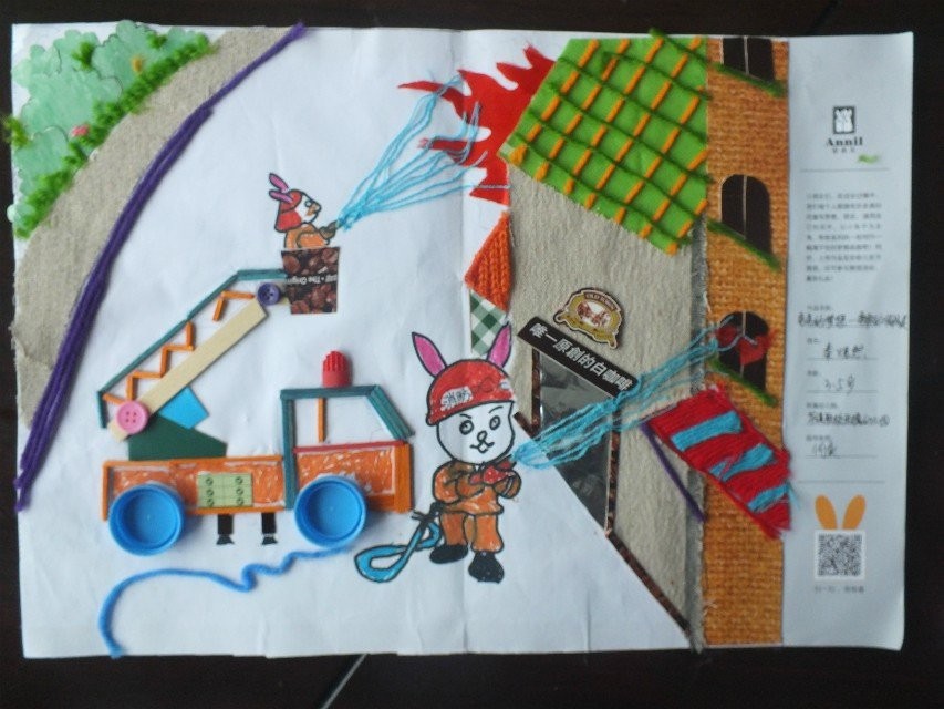 - 作品描述:可能在每个男宝宝心里都有一个英雄梦,警察、超人、消防员等人物,在孩子心目中就是英雄的标志,是孩子崇拜的对象,都想着长大后也能成为一个大英雄。所以熙宝贝认为,在兔兔心里,也会有一个梦想,一个当英雄的梦想,《勇敢的消防员》就由此诞生了。作品主要利用了我们生活中随手可见的一些废旧物品创作而成,如:废余布料、火柴棒、饮料瓶盖、毛线、纽扣、雪糕棒和食品外包装纸等,在环保的同时,又把兔兔的梦想表现了出来。