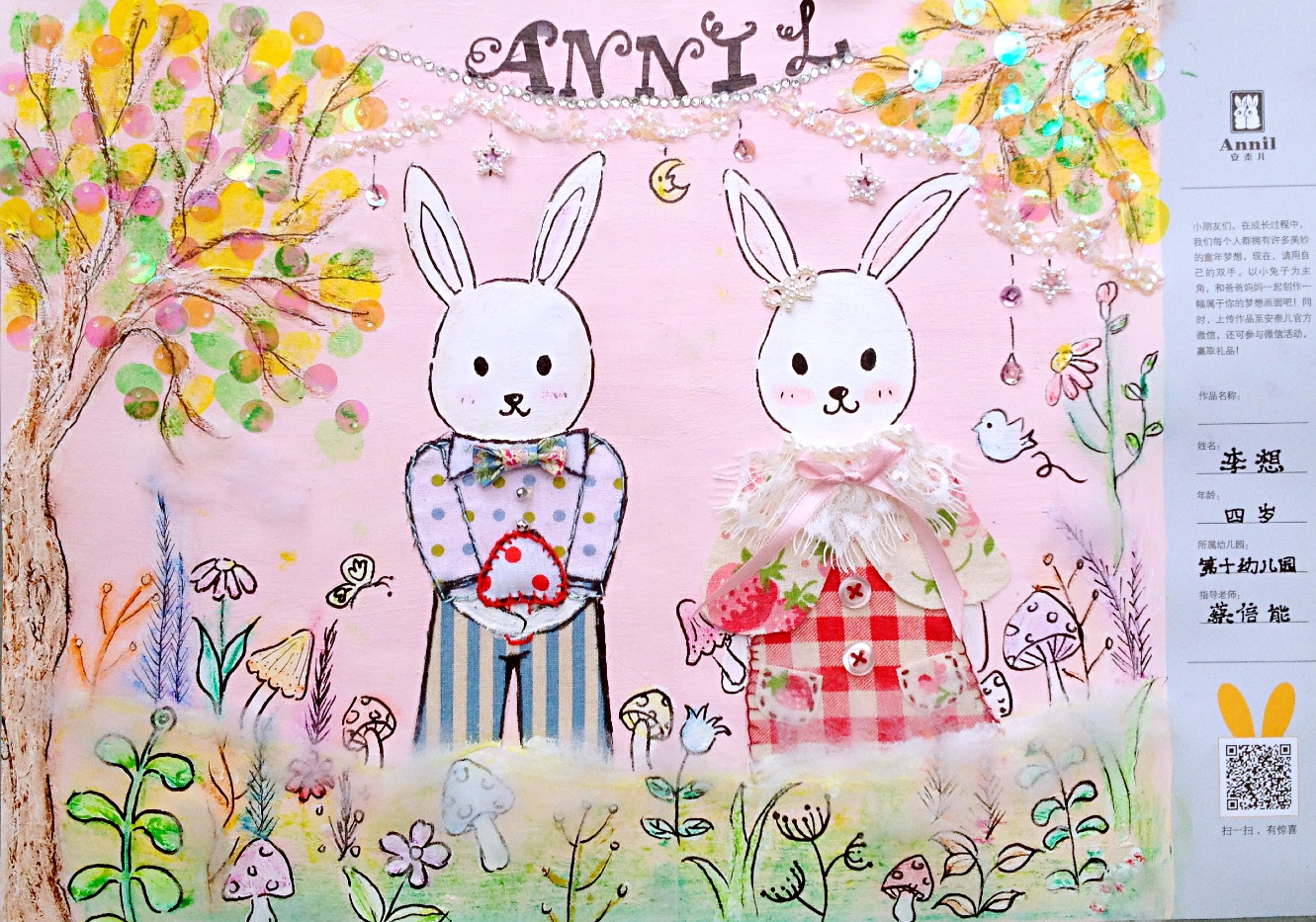 - 作品描述:梦游“安奈儿”仙境源于“梦游爱丽丝”:如果我们每一个人都如同爱丽丝一样,世界将会多么美好?没有骗子、没有小偷,人们互相尊重,没有纠纷、没有争执,世界上就没有了战争,该多么美好。希望安奈儿品牌能给家长提供放心的儿童服饰,让孩童拥有一个美好的童年!