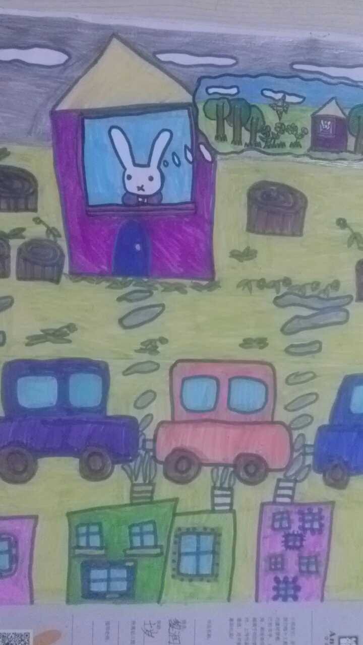 - 作品描述:兔兔眼睛治疗好后,兴奋地向窗外看:天是灰的,外面到处都是汽车,工厂排放的烟,枯萎地花和草还有被砍伐后树桩。与兔兔想像中的蓝天白云,绿绿的树青青的草盛开的花完全不一样。