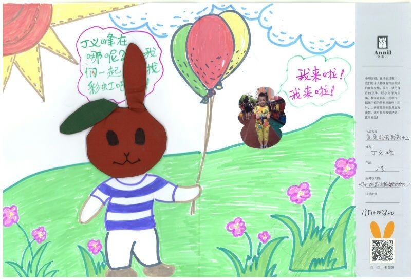 - 作品描述:我和兔兔大咖是好朋友,雨后的草地上散发着清新的空气,太阳也从云层里露出笑脸。大咖牵着彩色的汽球约我一起找彩虹,我欢快地向他蹦去,希望能找到神奇美丽的彩虹。