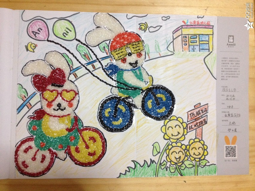 - 作品描述:创作理念:现在环境污染严重,人们处处提倡环保,借着这次亲子活动,我想让宝贝们更深刻的理解环保的重要性,能够切身投入到环保事业中。现在家家都是小公主、小王子,上下学都是车接车送,创作这幅《骑车去上学》让宝贝明白低碳生活,从我做起! 制作说明:本作品采用蜡笔填色和染色大米贴画技术,由妈妈和龙凤胎宝贝5566一起DIY制作,从而锻炼宝贝的专注力和耐心。 画面介绍:借着这次深圳市安奈儿股份有限公司的活
