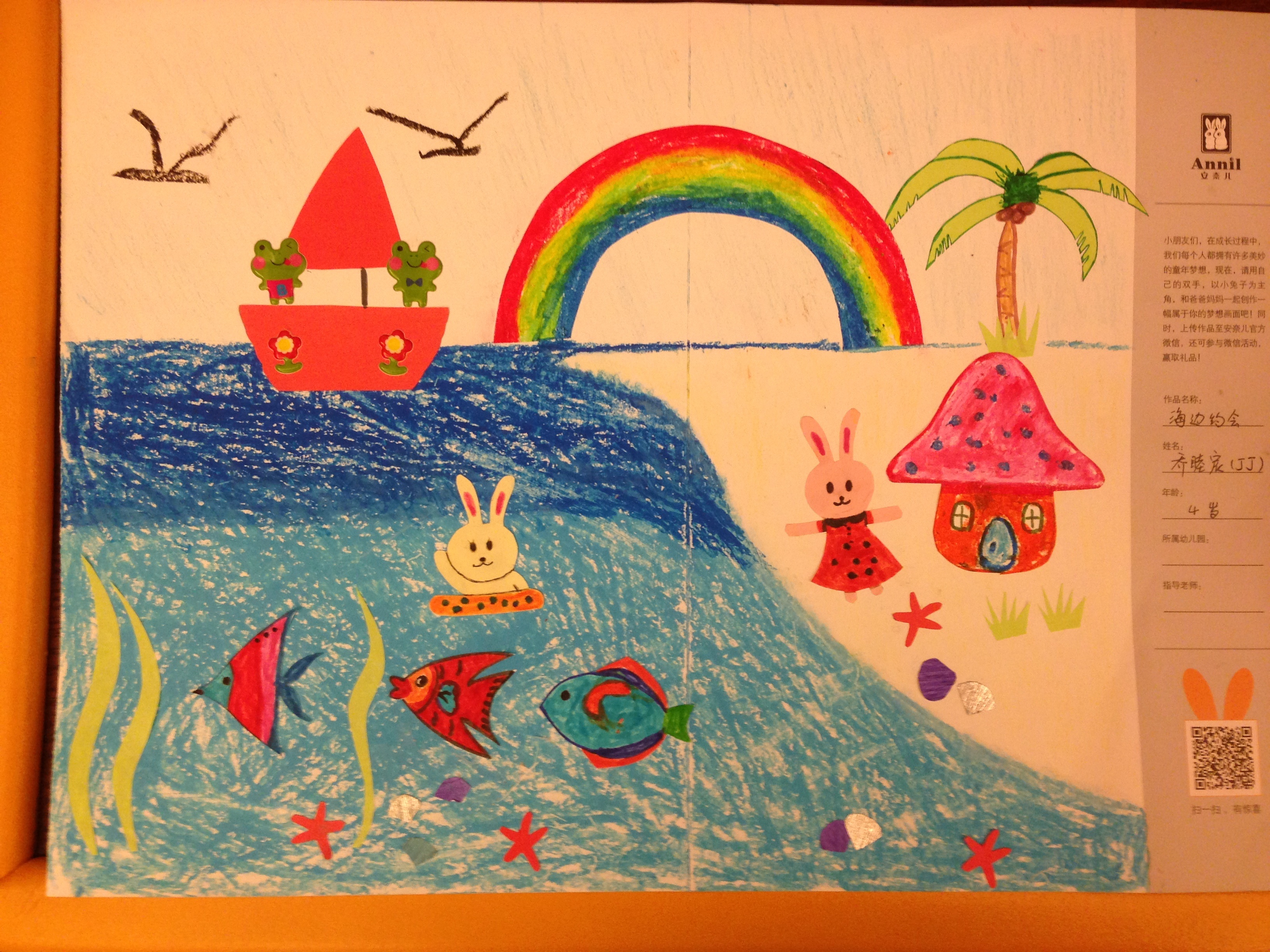 - 作品描述:丁丁从小喜欢海边,年初去了马尔代夫一直念念不忘。梦想可以和小伙伴一起在海边,捡贝壳,捉小螃蟹,游泳。在他的想法里,海里有美丽的鱼,天上有海鸥,还有他坐过的小船和水上飞机。在北京,他没有见过真的彩虹,但他希望在他梦想的海边可以有美丽的彩虹。