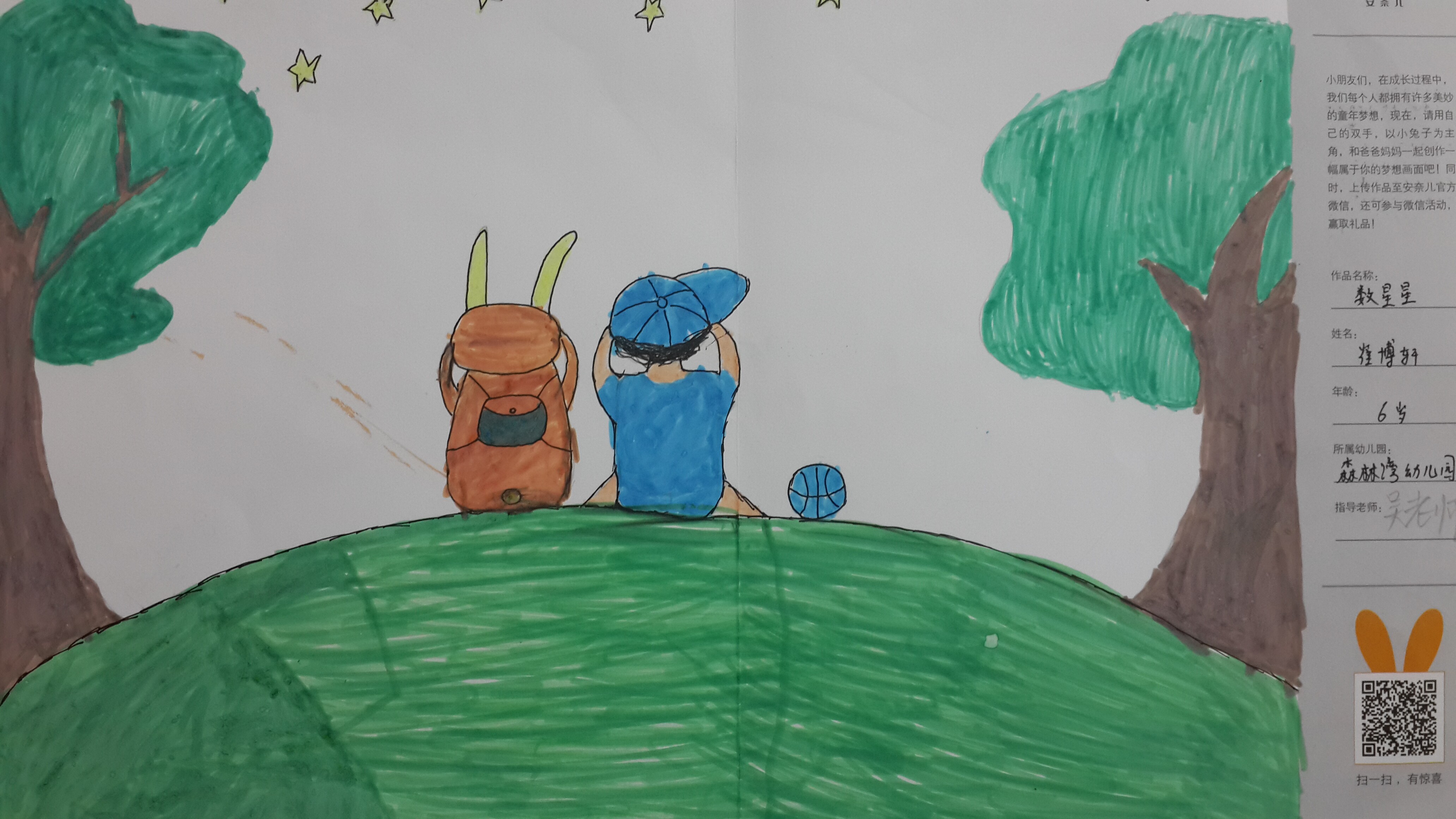 小兔兔和小男孩在静谧的星空下数星星