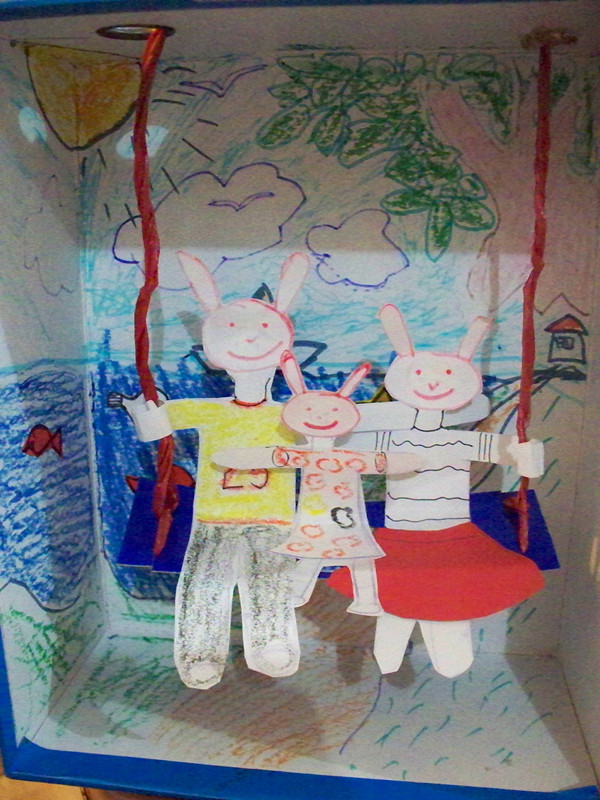 - 作品描述:贝贝一直喜欢玩水,玩沙,喜欢荡秋千,还喜欢有爸爸妈妈的陪伴,贝贝说,小兔子也有爸爸妈妈,她们是快乐的一家。 贝贝的愿望实现了,期望大家的愿望都能实现!